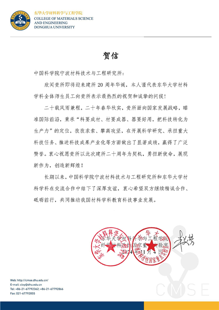 东华大学材料学院贺信