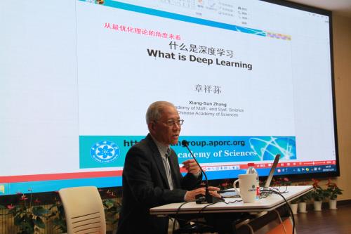 章祥荪以《从最优化的角度来看什么是深度学习》为题,从深度学习的(数学)基础 – 浅层人工神经网络、人工智能发展过程中的曲折、深度学习(由数学到工匠)的代表性网络、深度网络解OR问题等方面对深度学习进行了阐释。他指出,作为一名科研工作者,在不断优化深度学习算法、优化人工智能的同时,也要不断优化自己的人生。章祥荪以其科研工作为落脚点,从实践中阐述了勇攀高峰、追求真理的科学家精神内涵。