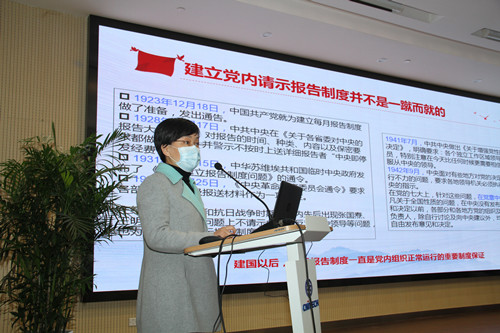 党委委员、副所长张瑞丽为大家解读了中共中国科学院党组关于贯彻落实《中国共产党重大事项请示报告条例》的通知精神,她结合党史讲述了请示报告制度建立的历史过程,梳理了各分院分党组、院属各单位党委需要向院党组请示的10类事项、需报告的9类事项以及需报备的5类事项,并指出所党委要进一步加强组织领导,编制请示报告事项清单,以钉钉子精神狠抓落实。
