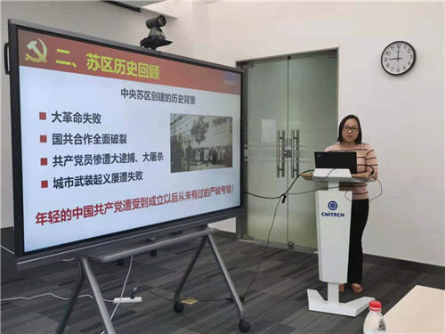 表面第二党支部书记孙丽丽结合参加中国科学院上海分院“基层组织建设年”四强党支部书记培训示范班的经历,回顾了苏区历史,并对“坚定信念、求真务实、一心为民、清正廉洁、艰苦奋斗、争创一流、无私奉献”的苏区精神进行了解读。