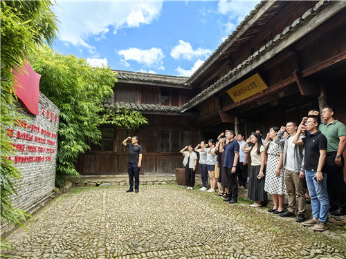 星火燎原,浙里梅香。调研的第一站位于宁海县岔路镇梅花村。1947年1月,中共浙东工委书记刘清扬和上海、台属地下党负责人张任伟、徐少春等6人,为传达“上海会议”精神在宁海县党员葛希曾家召开了一次台属工委干部会议,吹响了浙东武装斗争的号角,是浙东革命和台属地区武装斗争的一个重要转折点。近年来,梅花村依托丰厚的红色文化底蕴,推出“六+X”红色主题课程,开展形式多样的沉浸式、体验式研学活动,以红色资源带动绿色发展。党员们在当地老党员的解说中参观了梅花村会议旧址,并在李润伟的带领下重温了入党誓词,从党史中汲取奋进力量,在梅花村的发展历程中深刻领会“绿水青山就是金山银山”的丰富内涵。