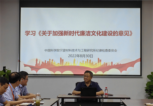 研究所纪委副书记、监督审计处处长陶永怀带领大家学习了党的十八大以来习近平总书记关于廉洁文化建设的系列重要讲话精神,介绍了党中央提出《关于加强新时代廉洁文化建设的意见》的目的,阐述了加强新时代廉洁文化建设的重大意义。他结合自身的学习体会,系统解读了夯实清正廉洁思想根基、厚植廉洁奉公文化基础、培养廉洁自律道德操守、发挥廉洁教育基础作用、弘扬崇廉拒腐社会风尚、加强组织保障这六个方面加强新时代廉洁文化建设的十八条具体举措。