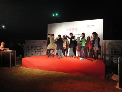 这次活动场地安排在庄市大道上的“万科城”售楼处。11日晚售楼处前的一处开阔地被布置一新。临时搭建了一个展示才艺的舞台,舞台旁边可以看到参与者的照片等宣传板,方便参与人了解相关信息。活动安排了“冷餐会”,以及自由组合、双人踩气球、快乐舞蹈、现场速配等一系列互动游戏,让参与者有机会展示自己,促进参与者之间的了解。