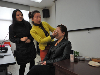 来自完美色彩工作室的专业人士,为工作在科研一线的女同志讲解了服饰色彩、发型彩妆及个人气质协调搭配方面的知识。讲课老师从服饰搭配开始,讲述了丝巾和饰品恰到好处的搭配、十分钟搞定生活妆、发型打理技巧,从色彩心理学的角度进入,揭示了色彩与人类皮肤的奥秘。参加培训的同志现场担任模特,接受老师的指导。