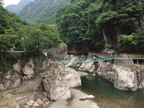 享用完丰盛的宁海美食,大家来到了浙东大峡谷。浙东大峡谷是在白溪水库建好后顺势开发的峡谷景区,因此很容易就能看到修建的蓄水大坝,乘着双层游船,行驶在湖面之上,谷底的湖水清澈见底,船上的我们感受着耳边吹拂而去的徐徐凉风,十分畅快。到了码头之后,大家拾级而上,修建的路比较平坦,走来并不十分费力,沿途还有清冽的泉水,偶尔还能见到一些奇形怪状的树石,有被命名为五指树,有被命名为石蛙阵的,细看确有几分神似。