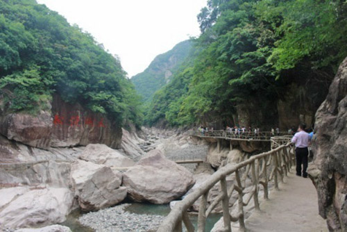 约莫二十分钟后,下了轮渡开始往里走。导游说,「以前可以直达月亮谷,可现在水位降低,只能步行进入。」于是,浩浩荡荡一行五十余人,朝着「月亮谷」方向行进。抬头便是一段陡峭的人造石阶,虽然大家嘀咕着这个「下马威」,仍未见退缩。登上石阶,映入眼帘的是依山而凿的石路。一路都在上台阶与下台阶间重复,虽无危险,但走起来并不舒坦。「月亮谷」何以如此矜贵,以致见你一面竟如此不易?