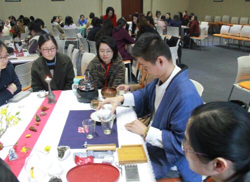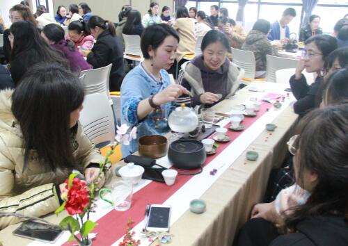 “你的韵味会说话”茶艺活动将大家的热情带到了一个高潮。此次讲座妇委会邀请了浙江省151第三层次人才、国家一级茶艺师、博士初晓恒副教授作为嘉宾,给大家讲解泡茶价值与方法。初晓恒自2008年以来致力于地区优秀茶艺人才的培养,先后培养了1000余名茶艺师,指导的学员代表在省市茶艺大赛上均有不俗的表现。宁波春山纪茶文化公司运营负责人刘纪龙老师给大家介绍了茶叶分类和茶叶品鉴方法、专业泡茶茶具名称、使用方法及用途等基本知识。根据老师的讲解,参加活动人员分成了7组,每组均有茶艺师教授大家用主冲泡器盖碗或小壶教授大家泡茶方法,并回答大家操作练习中的问题。大家尝试着自己冲泡的可口茶汤,进而在品茶泡茶中丰富人生韵味。