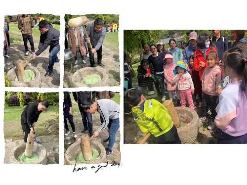 参观五洞桥景区后,我们便到了在水一方农庄享用美餐,餐后在农庄的一侧,大家兴奋地做起了青团。青团是江南一带的时令小吃,因其色调和形状得名,“捣青草为汁,和粉做粉团,色如碧玉”。据考证,大约始于唐代,距今已有一千多年的历史。青色的艾草汁与糯米粉结合,放入草地上的大石槽中,员工们纷纷撸起袖子想要秀一下自己“打青团”的技艺。手起锤落,青色的糯米团在重复的击打下变得越来越有韧劲,力气稍微小点的可是连锤子也提不起来呢!