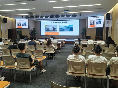 会上,胡本林主要对实验安全防护设施和使用进行讲解,详细介绍了实验废弃物存储和处置、实验药品和常用实验设备的使用注意事项,以及实验室安全事故处理流程,帮助实验人员在发生实验事故时能有条不紊的应对突发情况。