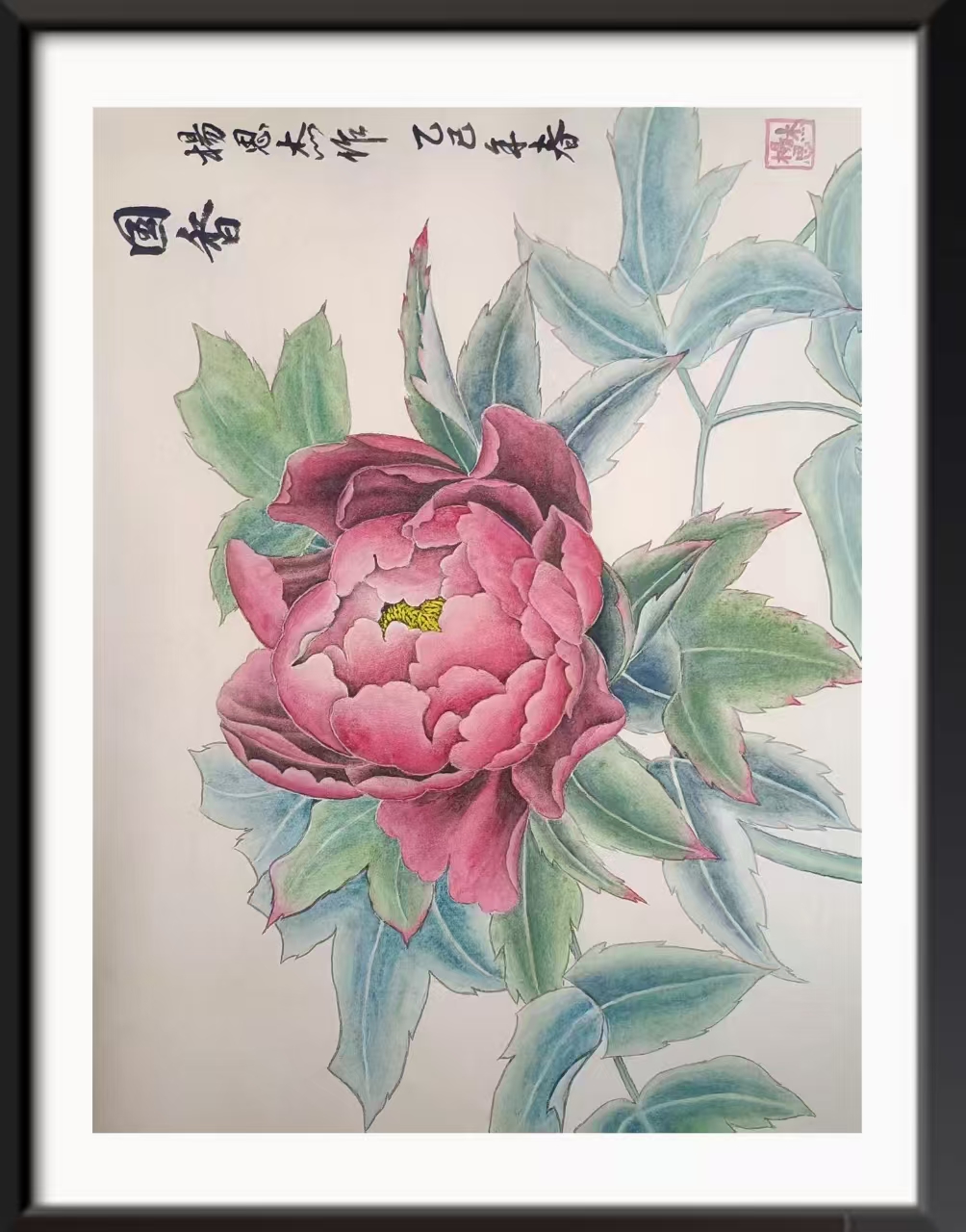 作品简介:《国香》以傲雪绽放的牡丹为主体,展现牡丹于寒冬中舒展筋骨、吐露芬芳的坚毅品格。画作取意"唯有牡丹真国色"的古韵,和科研工作者求真务实的探索精神具象为寒冬吐芳,将永不言弃的科研意志凝结为层叠绽放的花冠。作品以传统书画为载体,讴歌科研人如牡丹般历经风霜仍执着绽放,以智慧之蕊孕育国家科技之芬芳。
