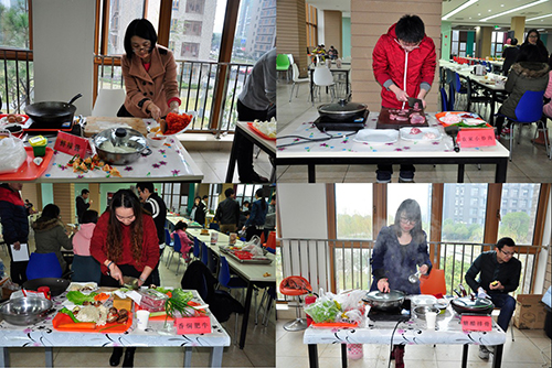 来自各科研部门的15支队伍参加了本次厨艺大赛,他们从煎、炸、焖、炒等方面展示了各自的绝妙厨艺。在主持人宣布比赛开始之后,各参赛队伍进入紧张的美食烹制过程中。他们有条不紊的配菜,精湛娴熟的刀工,使得评委和现场观众纷纷步入烹饪区仔细观赏。制作“鲜辣酱”的吴存存技巧娴熟,有了婆婆和尚在襁褓中的儿子场边的加油助威,她把芝麻、花生、辣椒神奇地混搭出一道滋味醇厚的特色山东菜,搭配西北地区的麻食,别具一番风味;来自稀土实验室的张恒带来了家乡的一道特色湘菜——“农家小炒肉”:细长的青尖椒配上切成薄片的五花肉,热油爆炒至金黄色,再加上蒜苗、料酒、醋等辅料,着实令人垂涎欲滴;本次比赛的“大”菜是来自纳米事业部罗利嘉的特色川菜“香焖肥牛”:一是食材“大”,共有肥牛片、香菇、青椒等十二种材料;二是工艺复杂,主菜兼用焖、炒技巧,配菜制作一气呵成;三是耗时长,用时近2小时才把这道麻、辣、鲜、香的香焖肥牛呈现在观众面前。