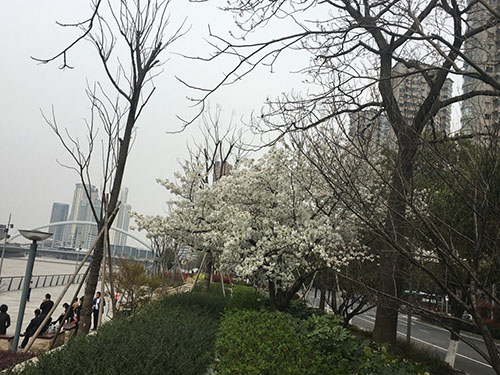 你看那江厦公园两岸,既修建了整洁舒适的滨江健身频道和自行车道,安放了不少方便的健身器材,而且岸边道路旁那一株株如云似雾的樱花,或白或粉的玉兰花,还有火红一片的垂丝海棠…春节刚过,寒冬未去之时,这些花儿就开始争先恐后地开放了,装点着甬江两岸。就连望京路、日湖边这些市区里的小河道两边,现在也是美景处处,岸边都修葺了凉亭、石桌,休闲椅,种上了花草树木,变成了小花园,成为大家休闲健身的首选场所。