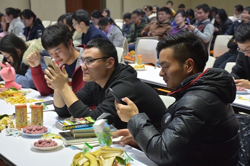 活动在研究生会主席付耀耀的主持下拉开帷幕。首先播放了日本导演新海诚的动画电影《你的名字》。浪漫的节日配上二次元的可爱画风,唤醒了大家深藏的童心,也触碰到了自己内心的柔软。观众很快就忘记了手边的水果与零食,深深地融入到了跌宕起伏的剧情中。