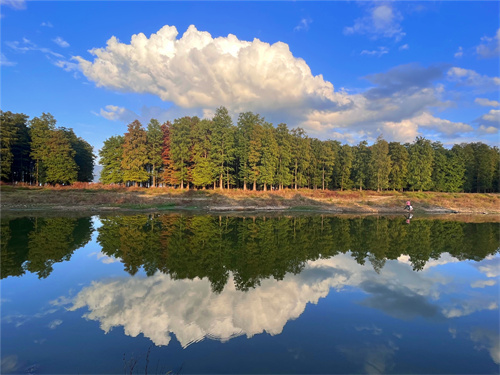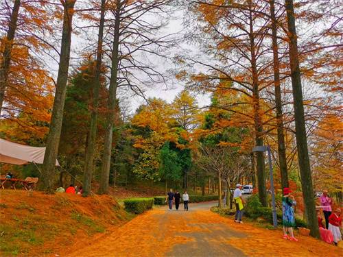 午餐过后,继续前往四明湖,秋水尽蓝;湖畔的水杉林,流水潺潺、树影婆娑,在秋风的画笔下,慢慢褪去葱郁,染上一抹金黄,树干笔直挺拔,于湖泊间拔地而起,蓝天、白云、红杉、绿水,明艳变幻的色调组成了奇妙的秋色画卷。