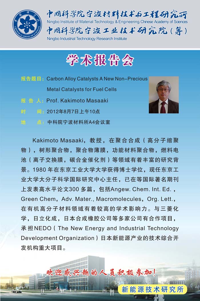 Kakimoto Masaaki:carbon alloy catalysts A New Non-Precious Metal Catalysts for Fuel Cells 发布:2012-07-26 点赞: 字号:小 大 打印: