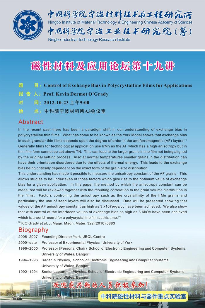 Kevin Dermot O'Grady:Control of Exchange Bias in Polycrystalline Films for Applications 发布:2012-10-15 点赞: 字号:小 大 打印: