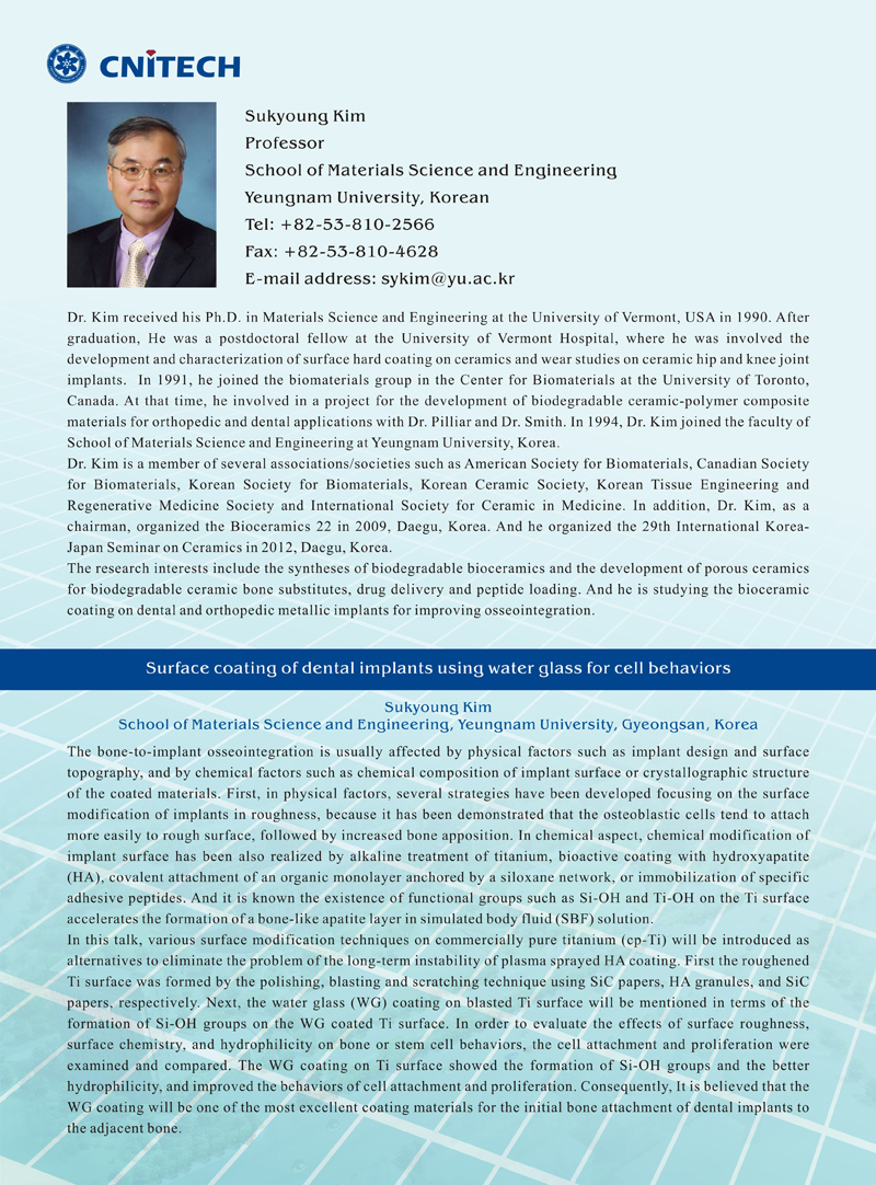 Sukyoung Kim:Surface coating of dental implants using water glass for cell behaviors 发布:2014-10-27 点赞: 字号:小 大 打印: 时间:10月27日 上午9:30-10:30地点:A5会议室