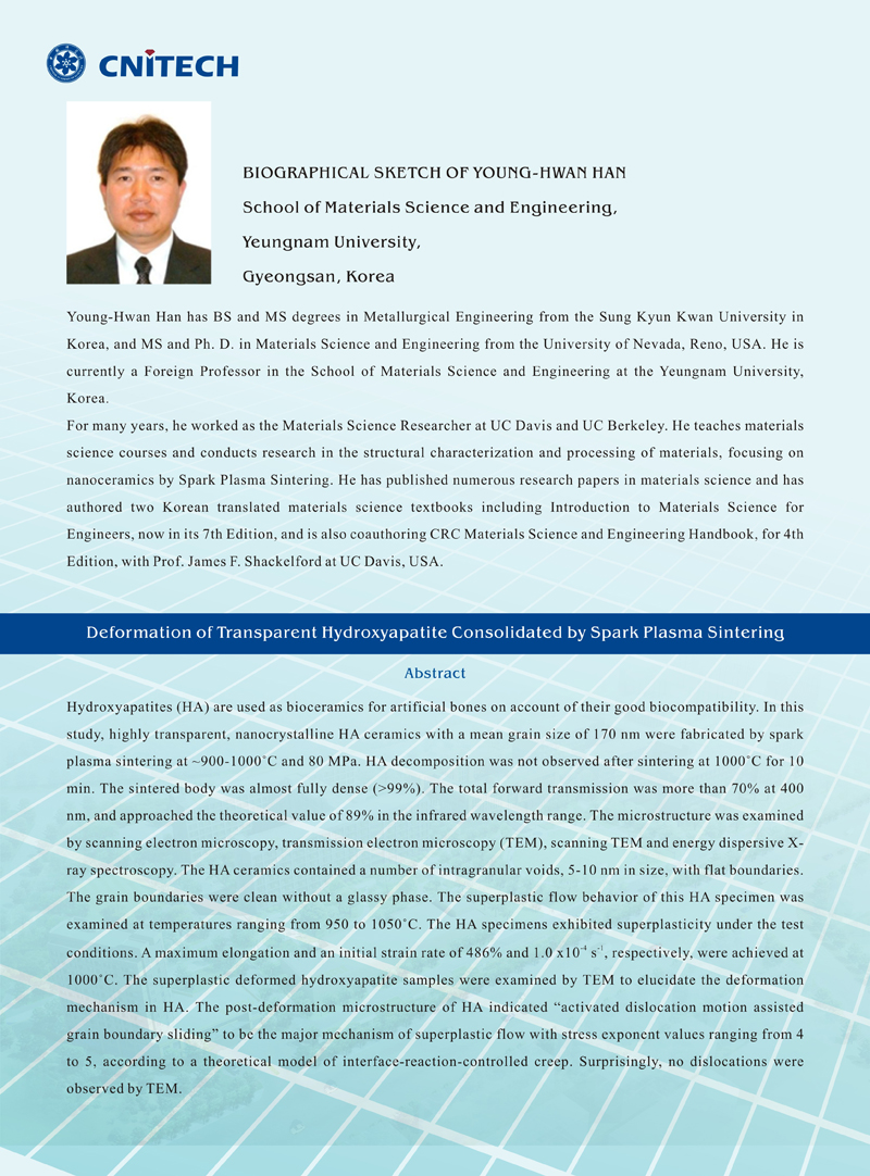 Young-Hwan Han:Deformation of Transparent Hydroxyapatite Consolidated by Spark Plasma Sintering 发布:2014-10-27 点赞: 字号:小 大 打印: 时间:10月27日 上午9:30-10:30地点:A5会议室