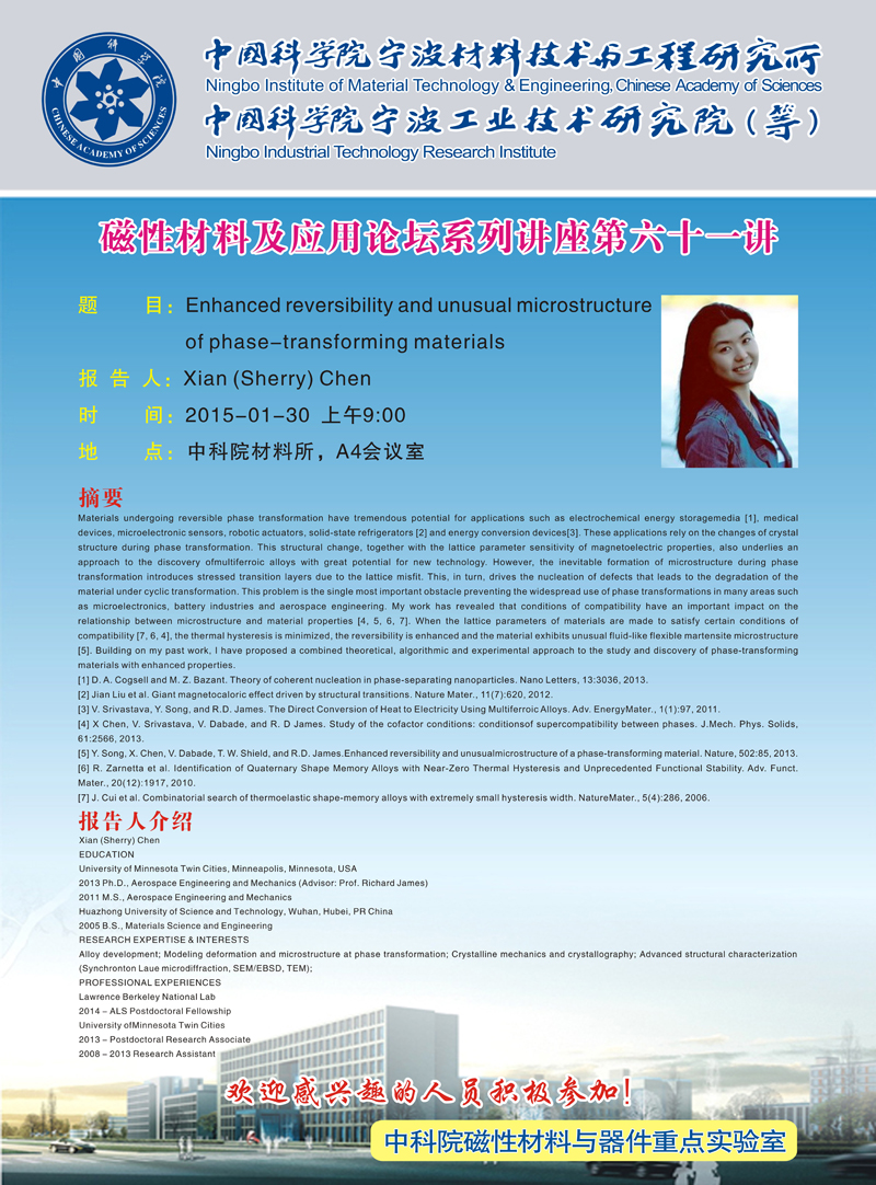 Xian Chen:Enhanced reversibility and unusual microstructure of phase-transforming materials 发布:2015-01-27 点赞: 字号:小 大 打印: