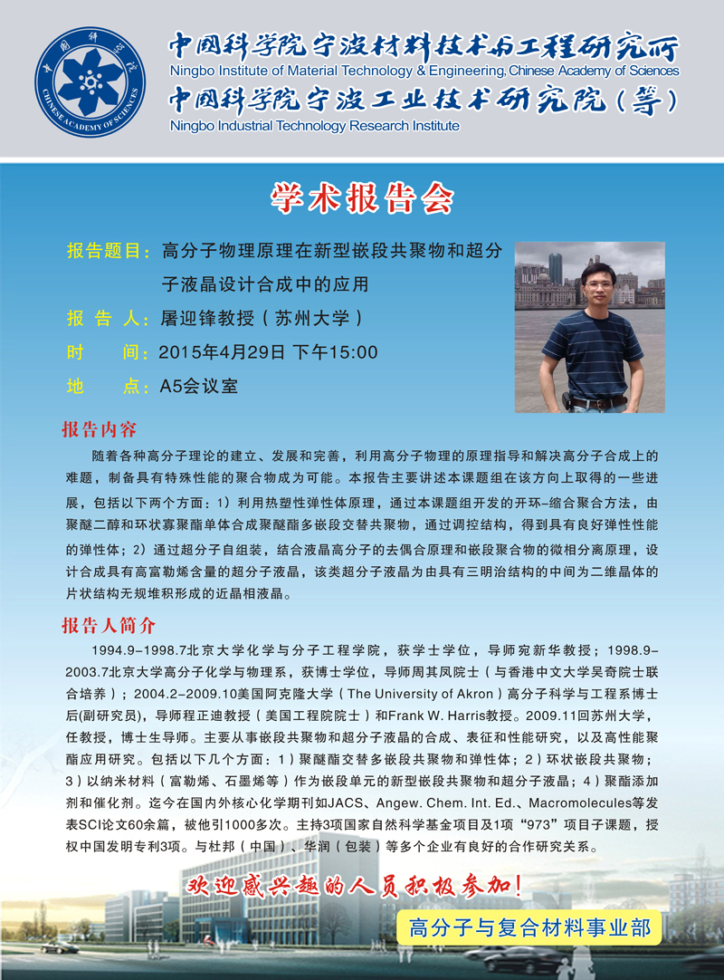 屠迎锋:高分子物理原理在新型嵌段共聚物和超分子液晶设计合成中的应用