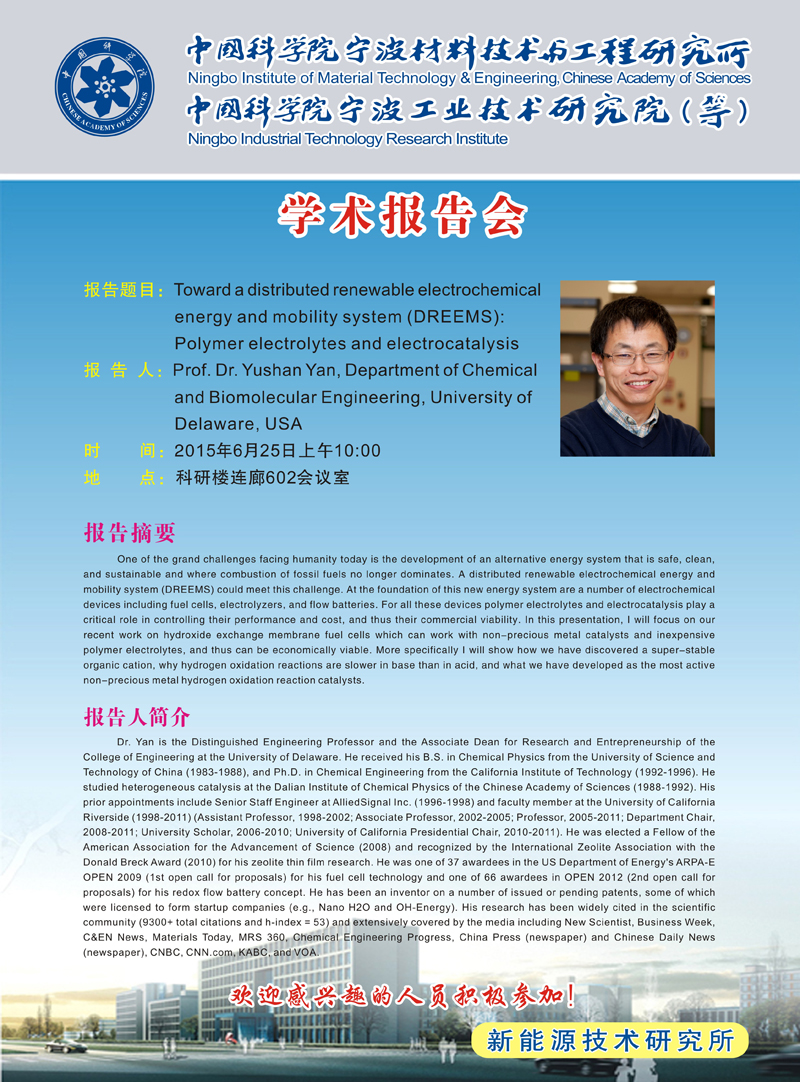 prof.Dr.Yushan Yan:Toward a distributed renewable electrochemical energy and mobility system(DREEMS):Polymer electrolytes and electrocatalysis 发布:2015-06-19 点赞: 字号:小 大 打印:
