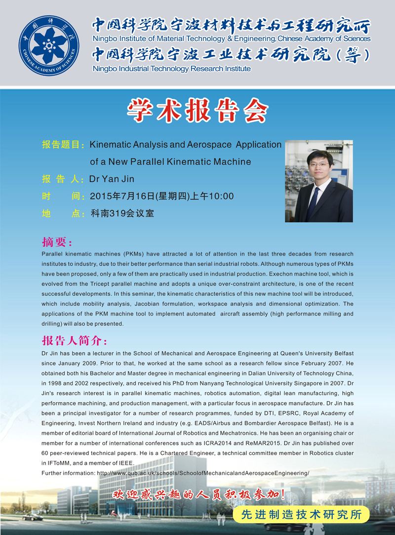 7月16日学术报告会:Yan Jin:Kinematic Analysis and Aerospace Application of a New Parallel Kinematic Machine 发布:2015-06-30 点赞: 字号:小 大 打印:
