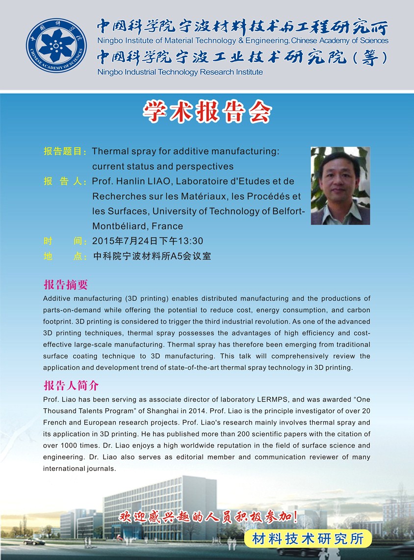 7月24日学术报告会:Hanlin Liao:Thermal spray for additive manufacturing:current status and perspectives 发布:2015-07-16 点赞: 字号:小 大 打印: