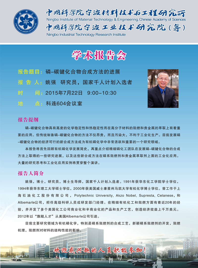 7月22日学术报告会:姚强:磷-碳键化合物合成方法的进展