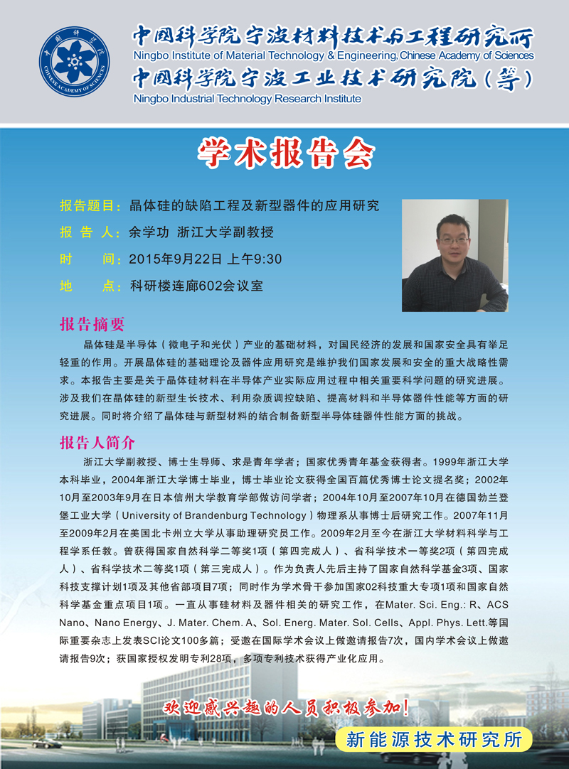 9月22日学术报告会:余学功:晶体硅的缺陷工程及新型器件的应用研究