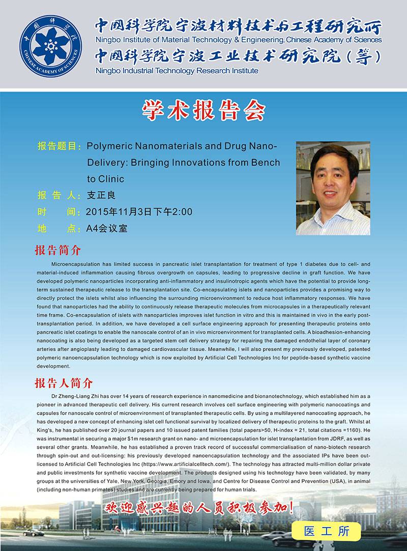 11月3日学术报告会:支正良:Polymeric Nanomaterials and Drug Nano-Delivery: Bringing Innovations from Bench to Clinic 发布:2015-10-28 点赞: 字号:小 大 打印: