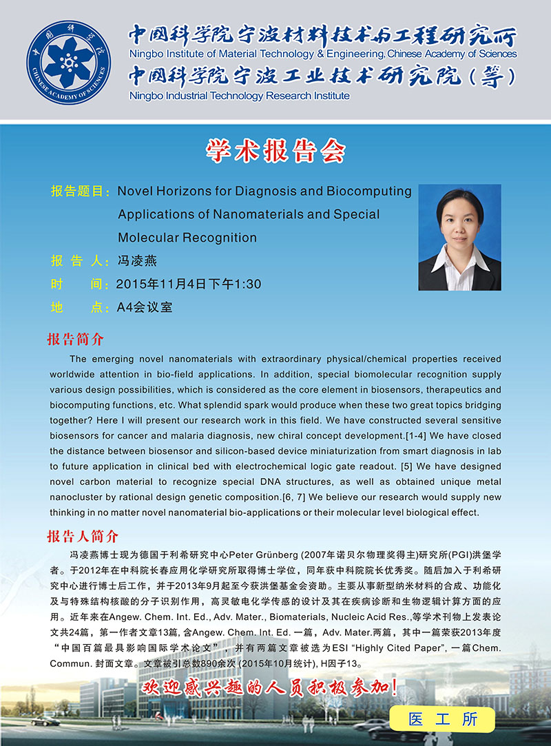 11月4日学术报告会:冯凌燕:Novel Horizons for Diagnosis and Biocomputing Applications of Nanomaterials and Special Molecular Recognition 发布:2015-10-30 点赞: 字号:小 大 打印: