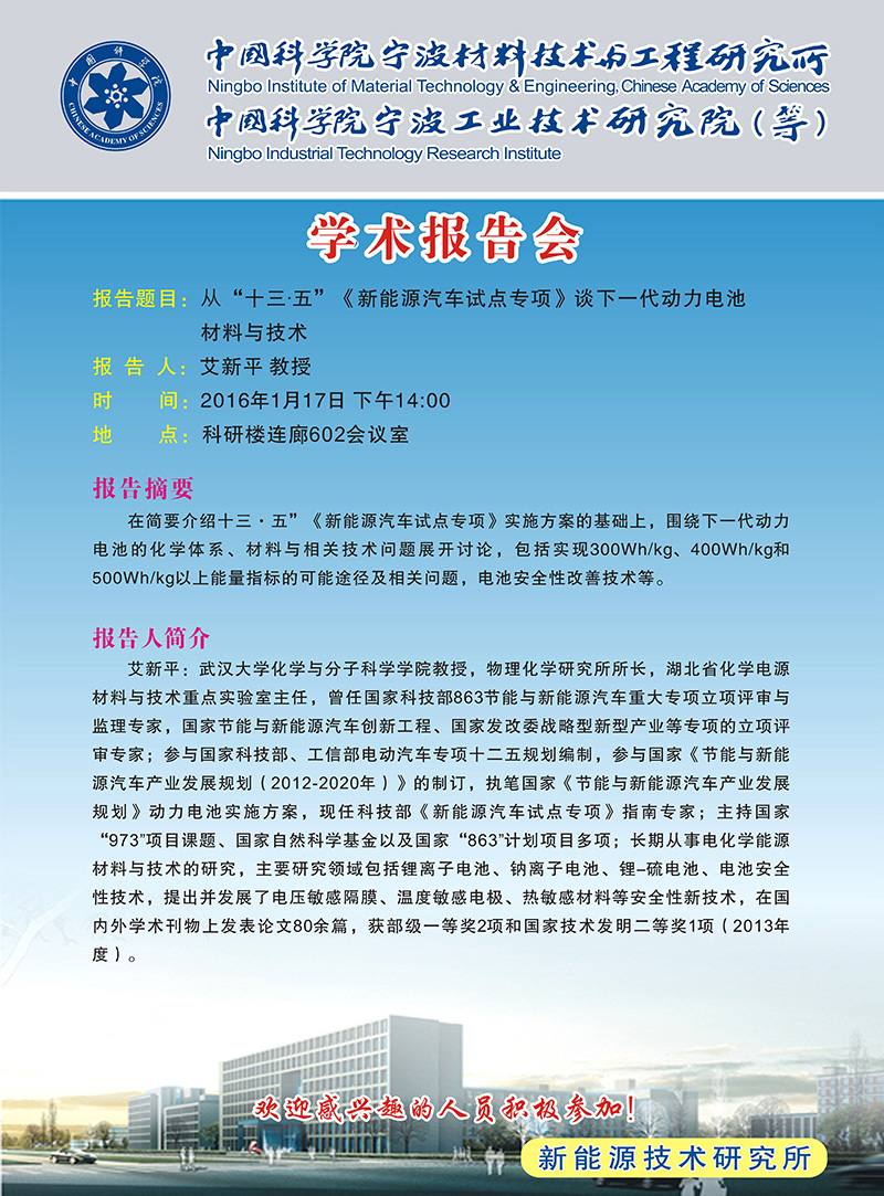 1月17日:艾新平:从“十三.五”《新能源汽车试点专项》谈下一代动力电池材料与技术