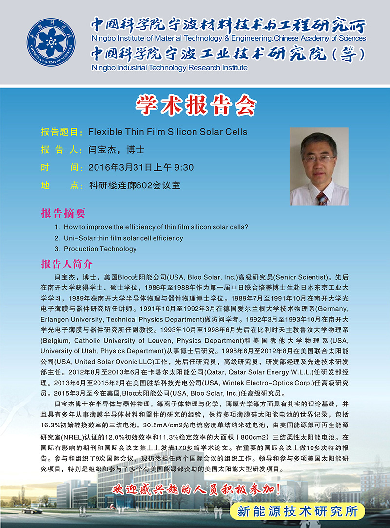 3月31日:闫宝杰:Flexible Thin FilmSilicon Solar Cells