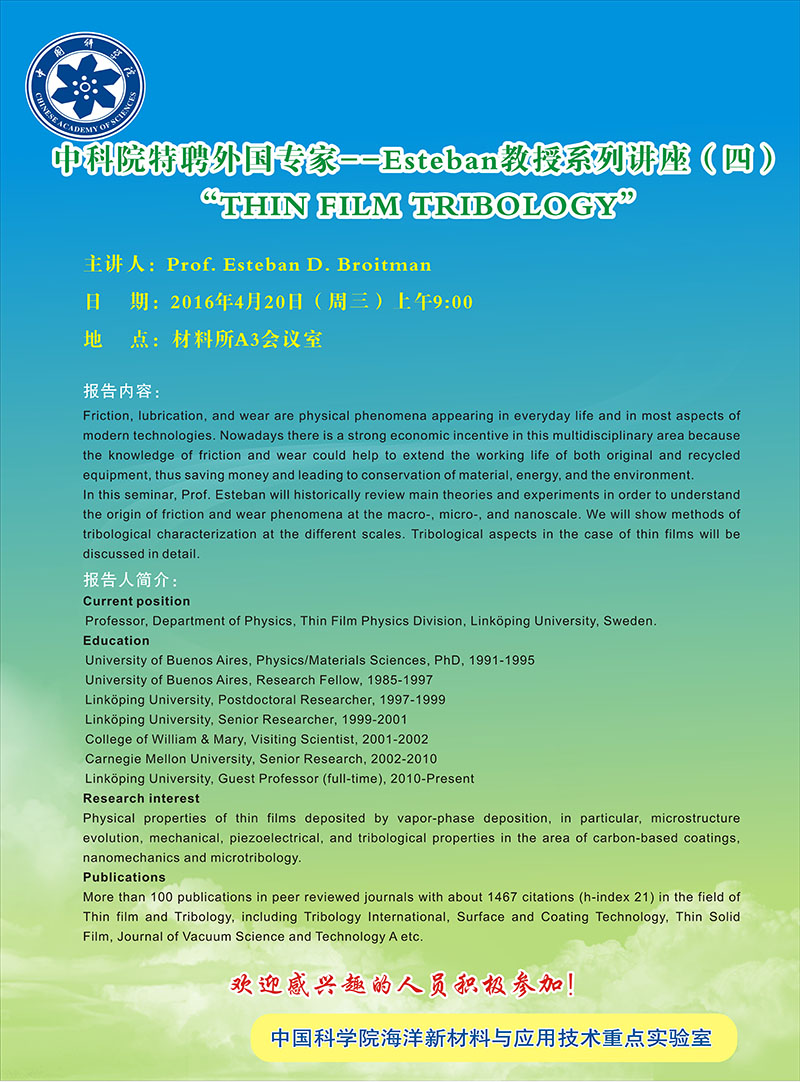4月20日:Prof. Esteban D. Broitman:Thin Film Tribology