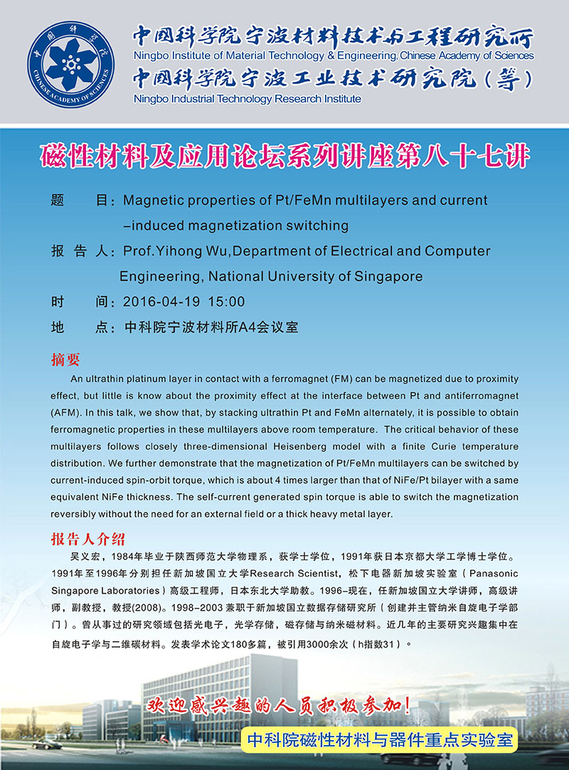 4月19日:Prof. Yihong Wu:Magnetic properties of Pt/FeMn multilayers and current-induced magnetization switching 发布:2016-04-18 点赞: 字号:小 大 打印: