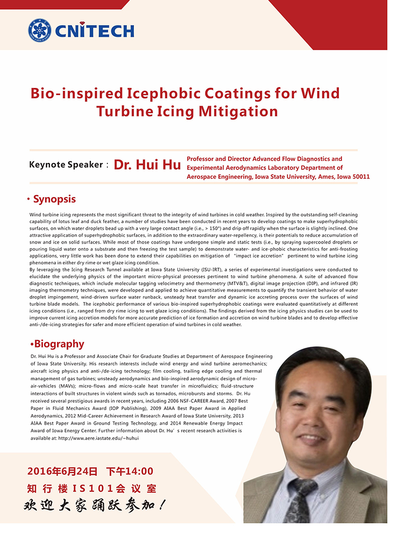 6月24日:Hui Hu:Bio-inspired Icephobic Coatings for Wind Turbine Icing Mitigation 发布:2016-06-21 点赞: 字号:小 大 打印: