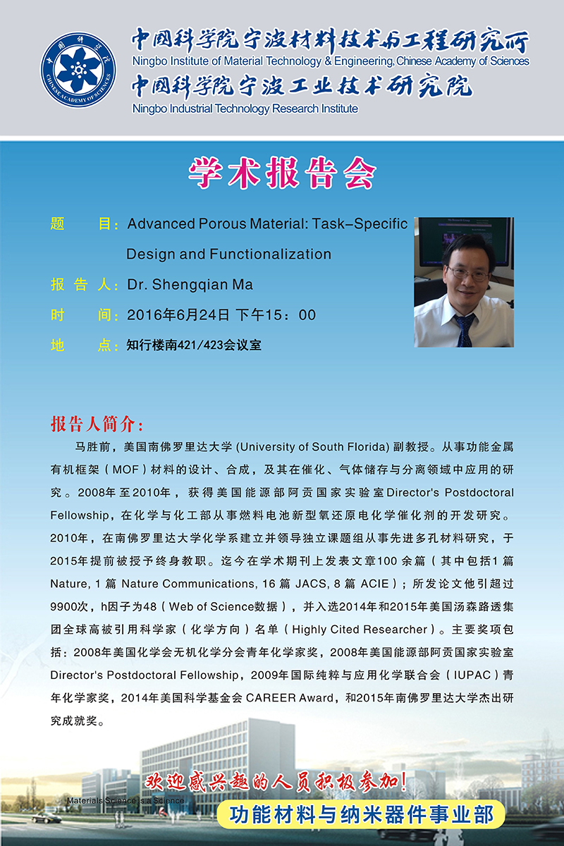 6月24日:马胜前:Advanced Porous Material:Task-Specific Design and Funcitionamization 发布:2016-06-23 点赞: 字号:小 大 打印: