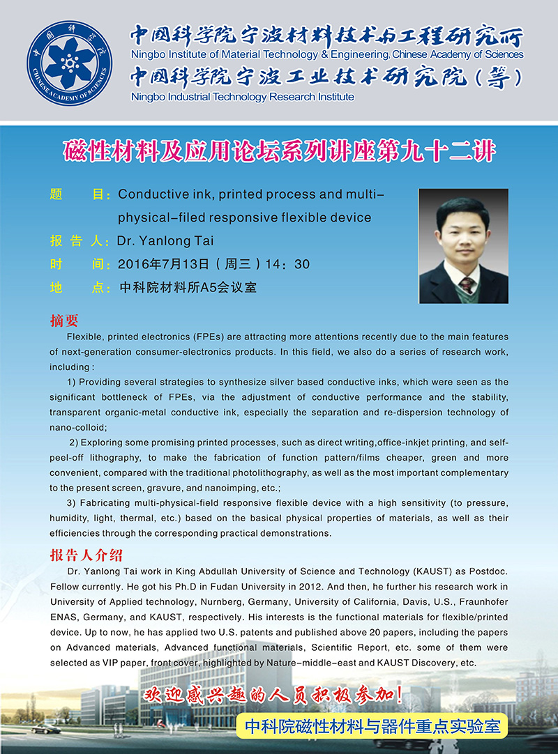 7月13日:Dr.Yanlong Tai:Conductive ink, printed process and multi-physical-filed responsive flexible device 发布:2016-07-06 点赞: 字号:小 大 打印: