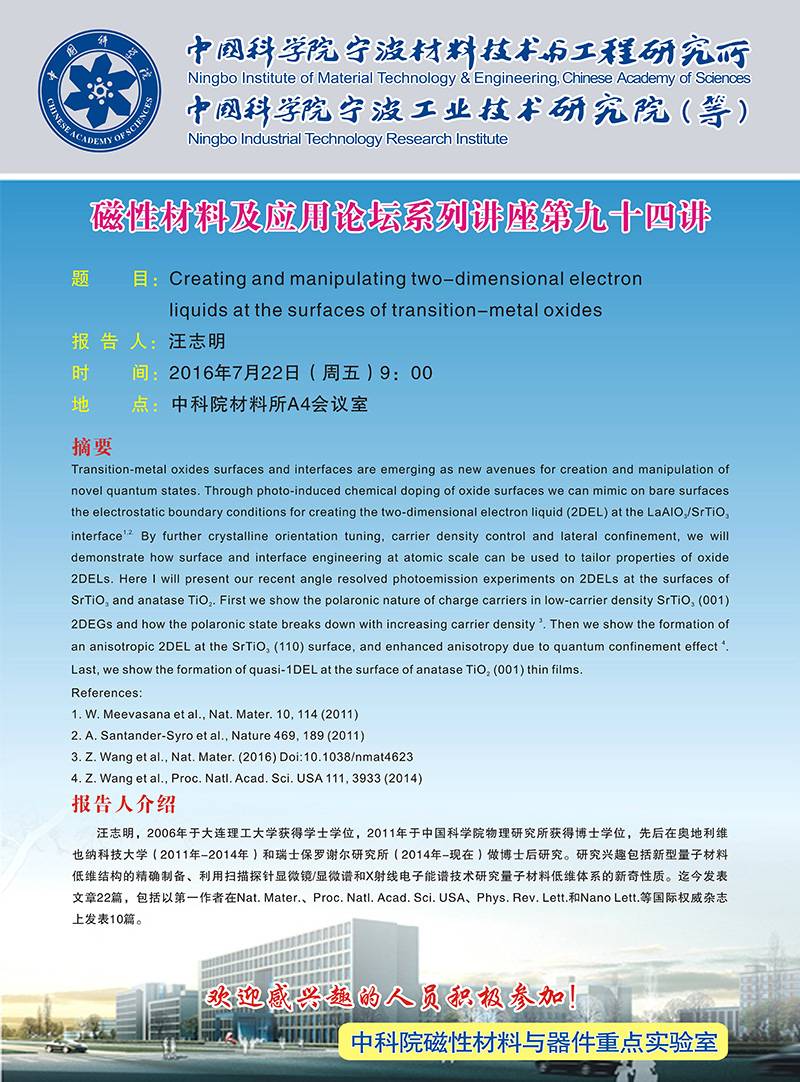 7月22日:汪志明:Creating and manipulating two-dimensional electron liquids at the surfaces of transition-metal oxides 发布:2016-07-18 点赞: 字号:小 大 打印:
