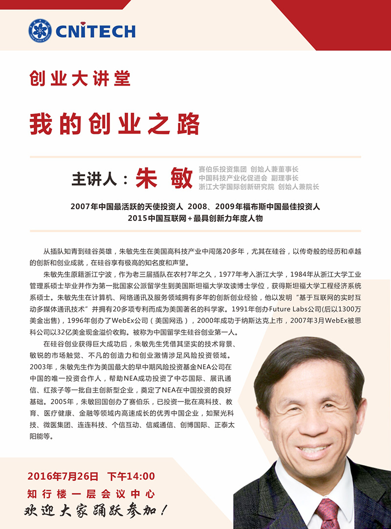 7月26日:创业大讲堂:朱敏《我的创业之路》