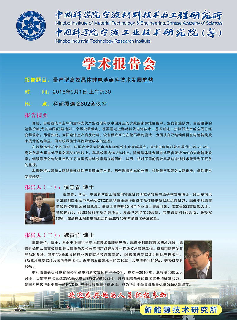 9月1日:学术报告会:量产型高效晶体硅电池组件技术发展趋势
