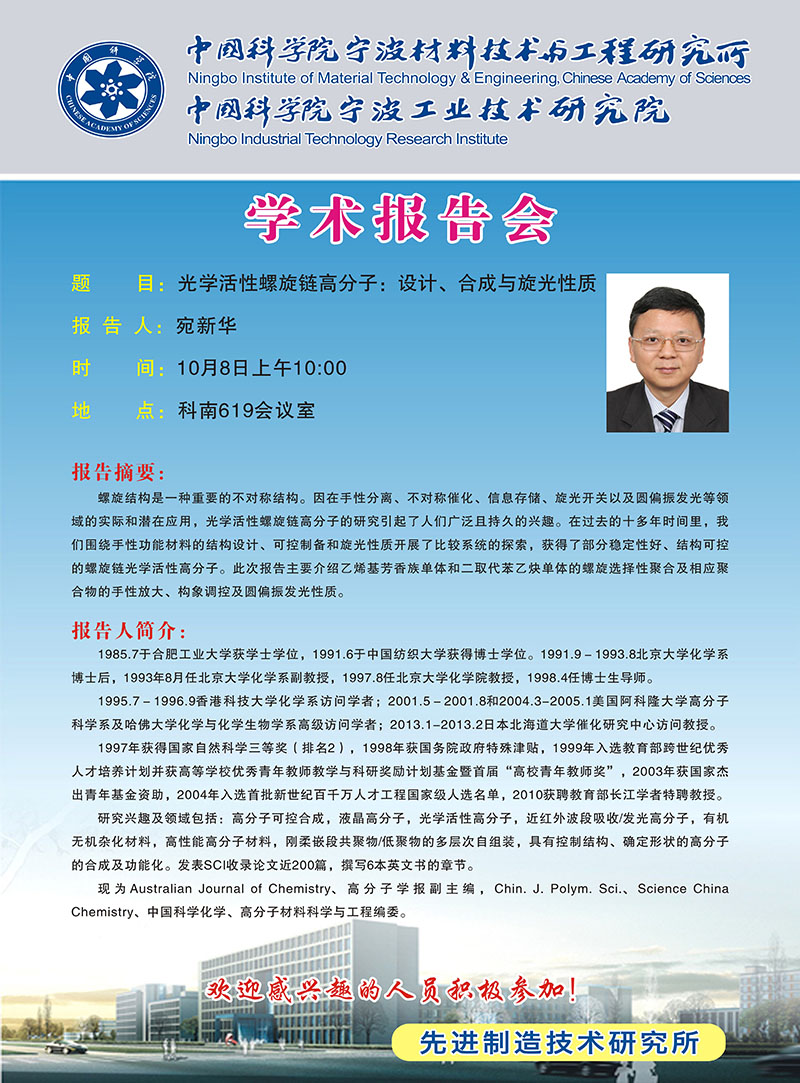 10月8日:宛新华:光学活性螺旋链高分子:设计、合成与旋光性质