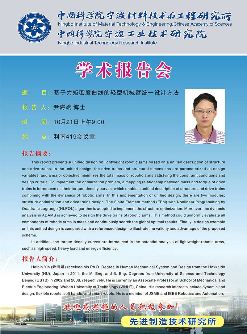 10月21日:尹海斌:基于力矩密度曲线的轻型机械臂统一设计方法
