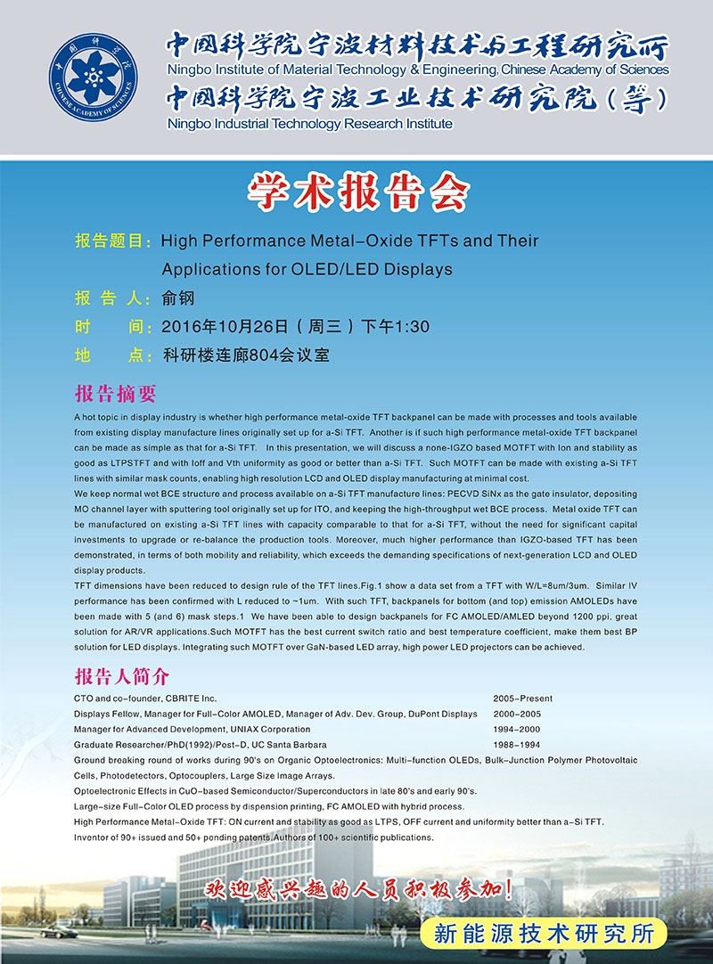 10月26日:俞钢:High Performance Metal-Oxide TFTs and Their Applications for OLED/LED Displays 发布:2016-10-24 点赞: 字号:小 大 打印: