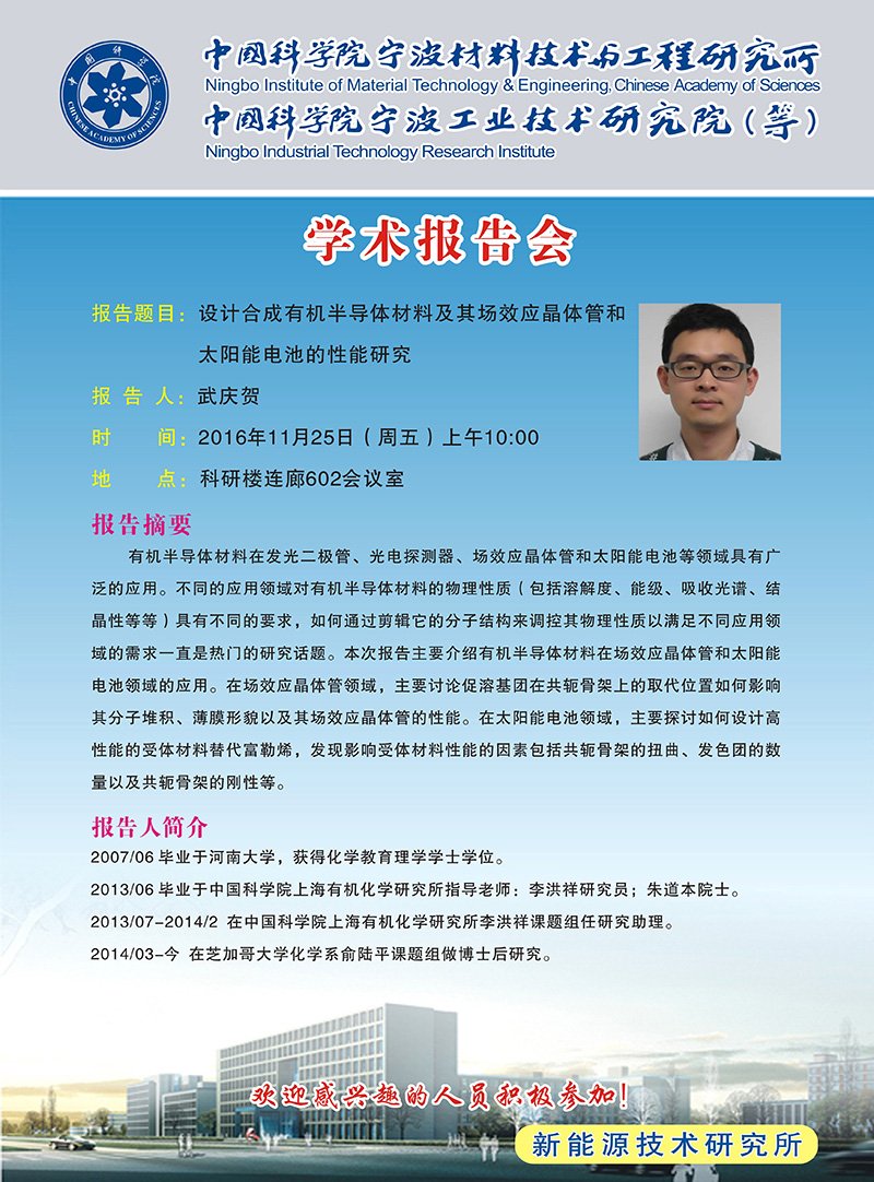 11月25日:武庆贺:涉及合成有机半导体材料及其场效应晶体管和太阳能电池的性能研究