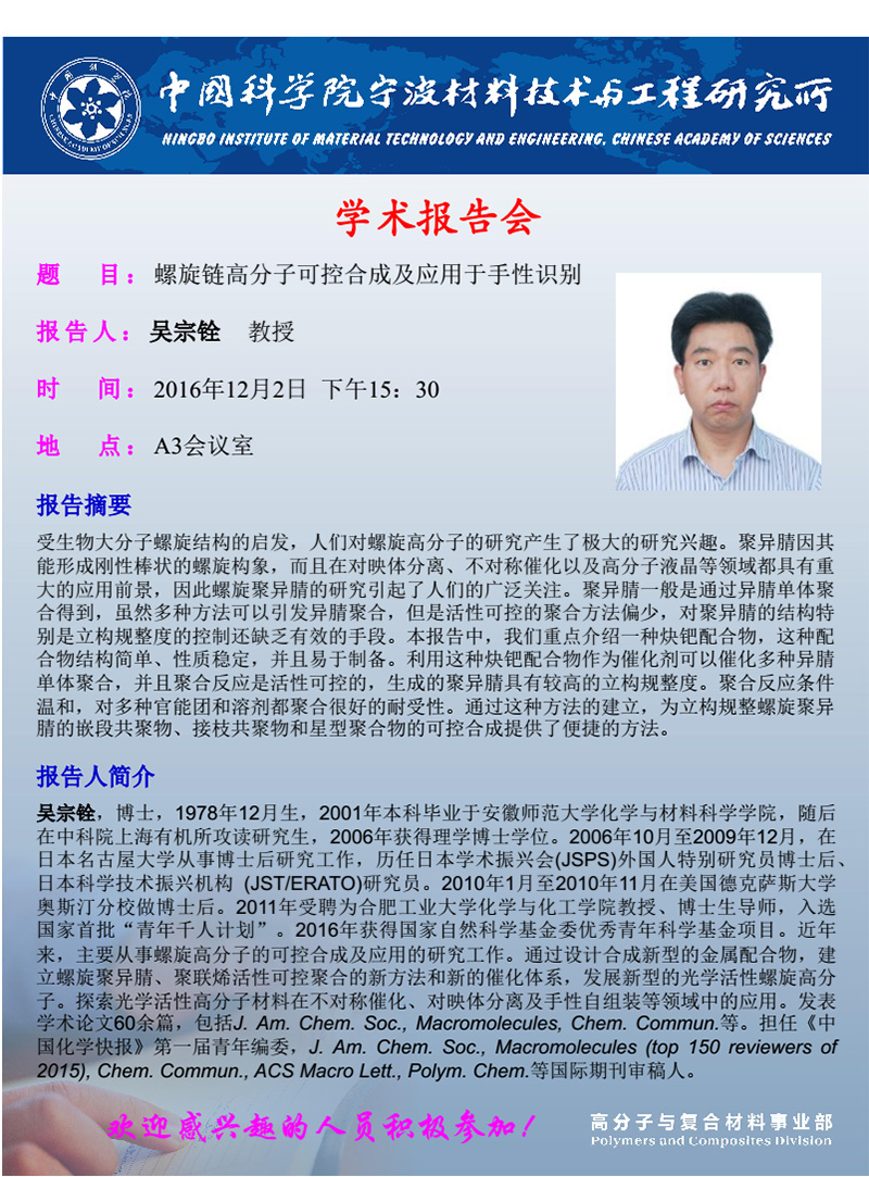 12月2日:吴宗铨:螺旋链高分子可控合成及应用于手性识别