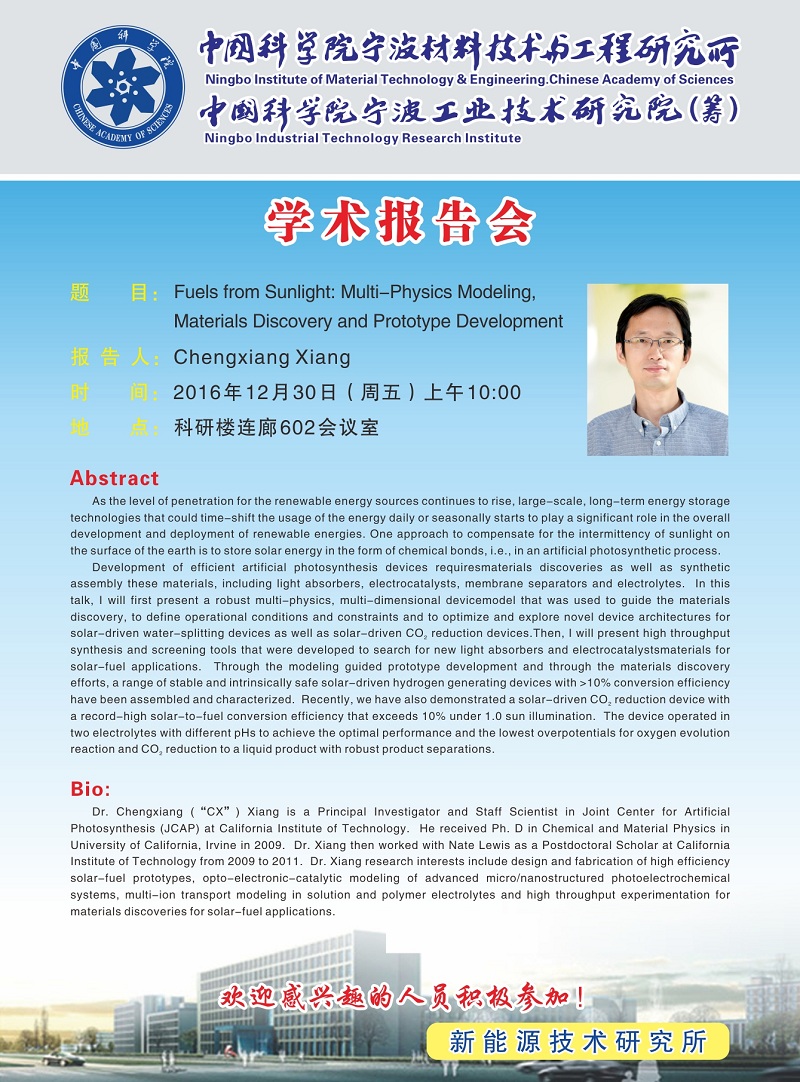 12月30日:Chengxiang Xiang:Fuels from Sunlight:Multi-Physics Modeling, Materials Discovery and Prototype Development 发布:2016-12-19 点赞: 字号:小 大 打印: