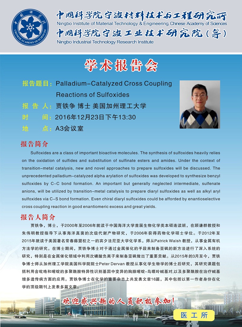 12月23日:贾铁争:Palladium-Catalyzed Cross Coupling Reactions of Sulfoxides