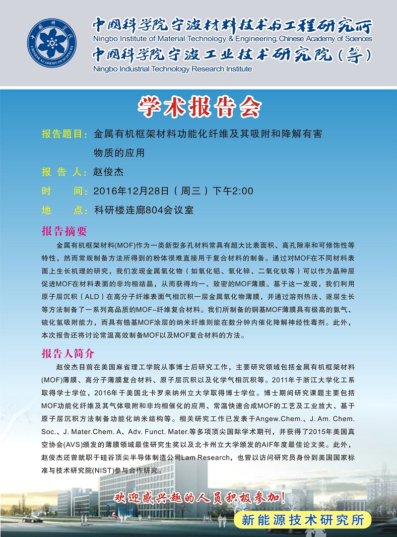 12月28日:赵俊杰:金属有机框架材料功能化纤维及其吸附和降解有害物质的应用