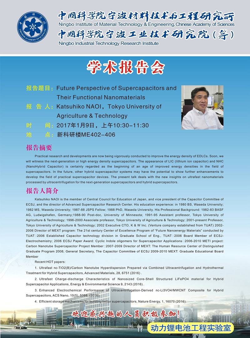 1月9日:Katsuhiko NAOI:Future Perspective of Supercapacitors and Their Functional Nanomaterials 发布:2017-01-05 点赞: 字号:小 大 打印: